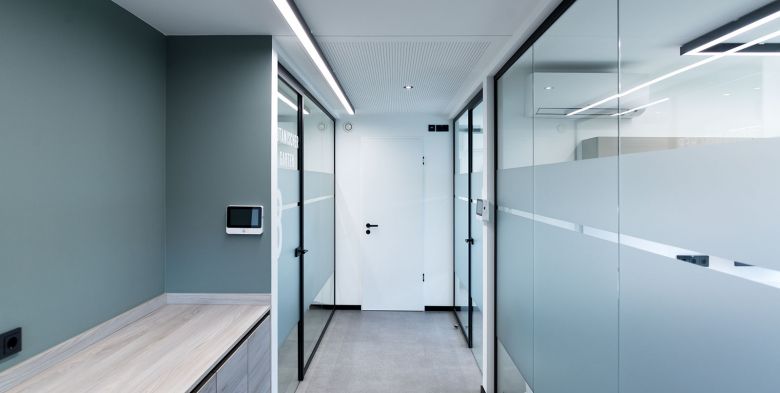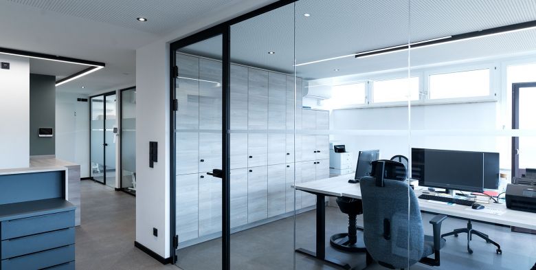 Die großzügig eingesetzten Glasflächen erzielen einen weiten Raumeindruck mit viel Tageslicht. Unterstützt wird dies durch das durchgehende Lichtkonzept.